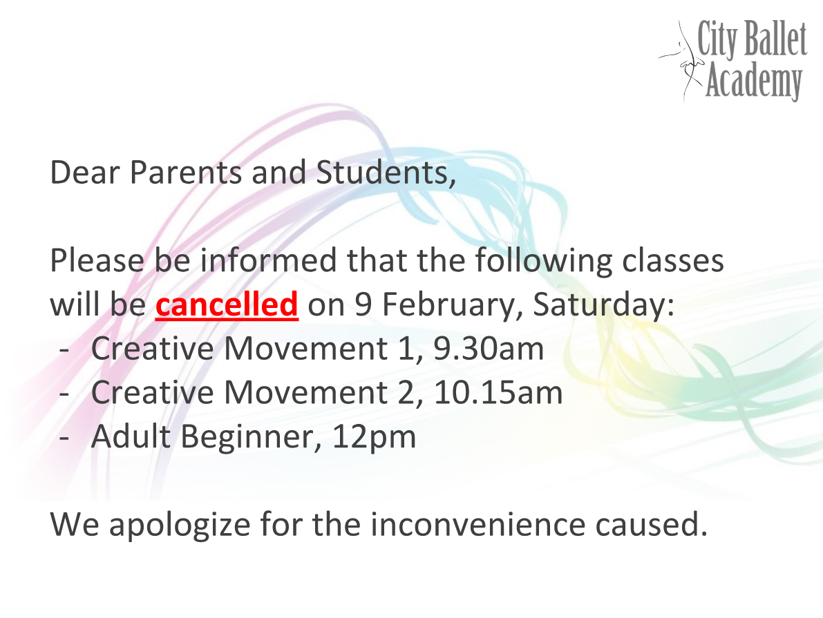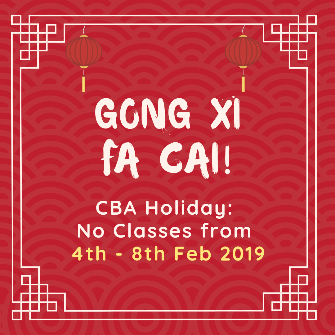 Please be informed that we will be having our Academy Holiday from 4th – 8th February 2019. There will be no regular classes during this period. Thank you and we wish everyone a Happy and Prosperous Chinese New Year!